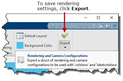 После работы в Volume Viewer для наилучшего просмотра данных можно сохранить настройки визуализации и конфигурацию камеры. Средство просмотра томов хранит эту информацию в структуре, называемой config по умолчанию записывается в рабочую область. Эту структуру можно использовать с помощью volshow и labelvolshow для воссоздания вида, созданного в средстве просмотра объемов.