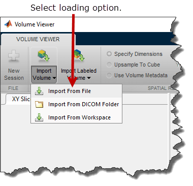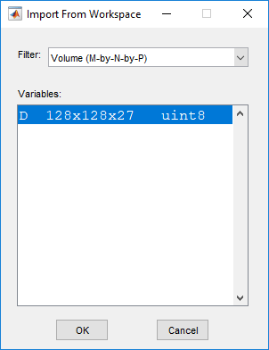 Загрузите объемные данные в приложение Volume Viewer. Щелкните Импорт тома. Можно загрузить изображение, указав его имя файла, или загрузить переменную из рабочей области. При наличии объемных данных в формате DICOM, использующих несколько файлов для представления тома, можно указать имя папки DICOM. Выберите параметр «Импортировать из рабочей области», поскольку данные находятся в рабочей области.