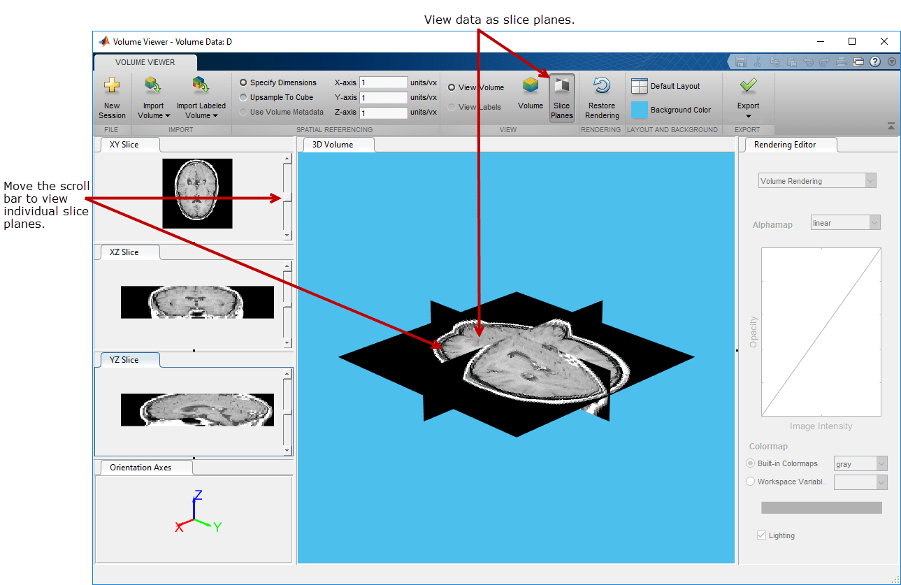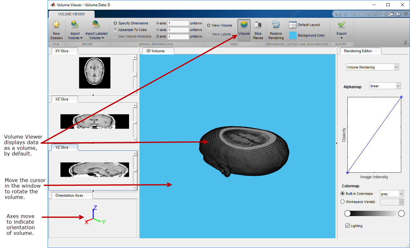 В этом примере показано, как просматривать и исследовать 3-D объемные данные с помощью приложения Volume Viewer. Визуализация громкости сильно зависит от определения соответствующей альфа-карты, так что структуры в данных, которые вы хотите видеть, непрозрачны, а структуры, которые вы не хотите видеть, прозрачны. Для иллюстрации пример загружает МРТ-исследование человеческой головы в Volume Viewer и исследует данные, используя возможности визуализации Volume Viewer.
