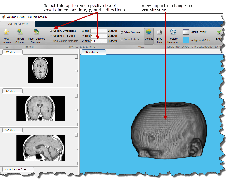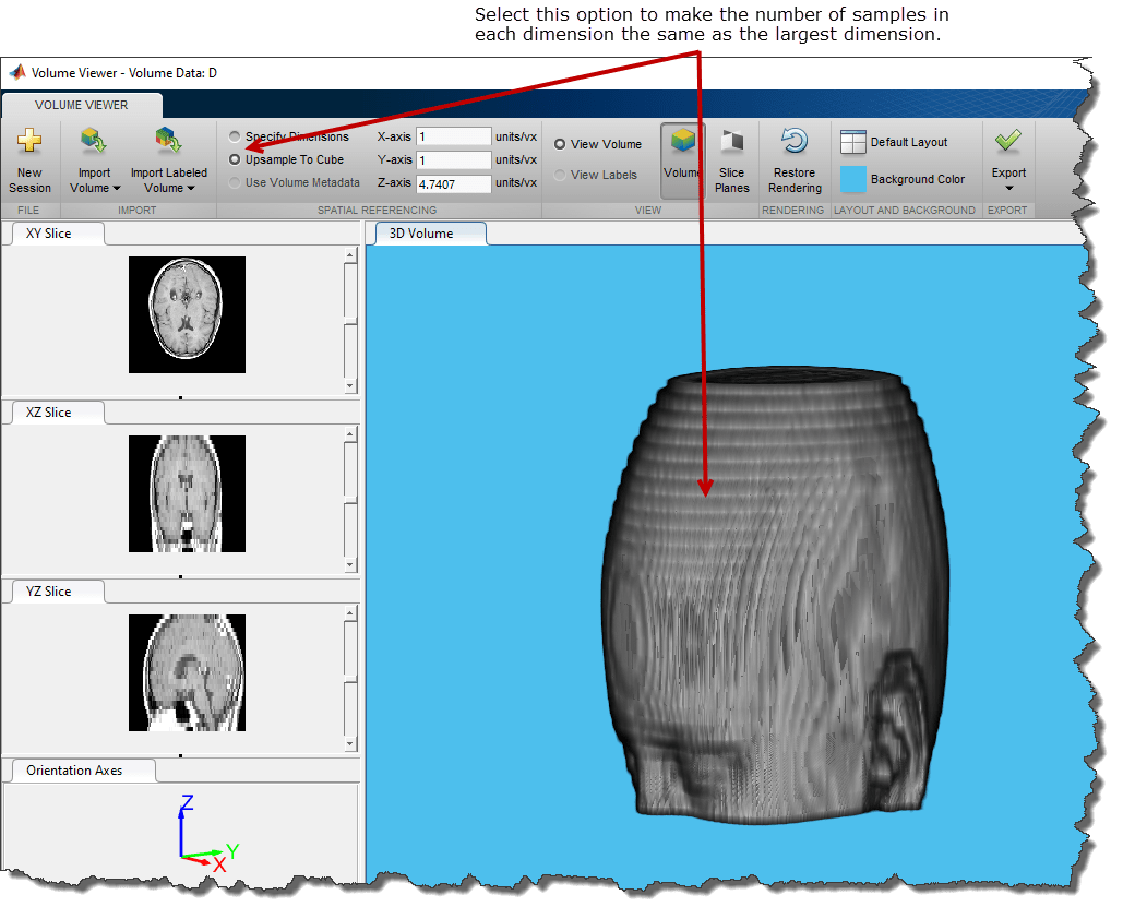 Upsample To Cube - Volume Viewer вычисляет масштабный коэффициент, который делает число выборок в каждом измерении таким же, как и наибольшее измерение в объеме. Эта настройка может привести к более правильному масштабированию данных без изотропной выборки.