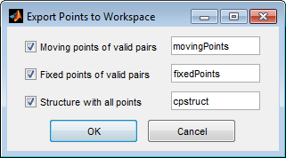 Чтобы сохранить управляющие точки в рабочем пространстве, выберите команду Файл (File) в строке меню Инструмент выбора управляющих точек (Control Point Selection Tool), а затем выберите опцию Экспортировать точки в рабочее пространство (Export Points to Workspace). Инструмент «Выбор контрольной точки» отображает следующее диалоговое окно: