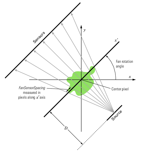 На следующем рисунке показана геометрия, используемая fanbeam функция при FanSensorGeometry имеет значение 'line'. На этом рисунке обратите внимание на то, как указать положение датчиков, указав расстояние между ними в пикселях вдоль оси x '.
