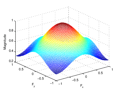 Преобразование Фурье импульсной характеристики линейного фильтра дает частотную характеристику фильтра. Функция freqz2 вычисляет и отображает частотную характеристику фильтра. Частотная характеристика ядра свертки Гаусса показывает, что этот фильтр проходит низкие частоты и ослабляет высокие частоты.