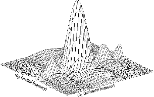 Пик в центре графика равен F (0,0), что является суммой всех значений в f (m, n). На графике также показано, что F (start1, start2) имеет больше энергии на высоких горизонтальных частотах, чем на высоких вертикальных частотах. Это отражает тот факт, что горизонтальные сечения f (m, n) являются узкими импульсами, в то время как вертикальные сечения являются широкими импульсами. Узкие импульсы имеют большее высокочастотное содержание, чем широкие импульсы.