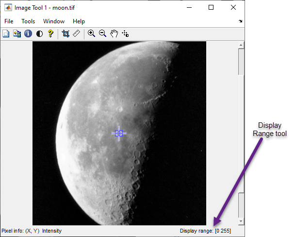 Средство просмотра изображений предоставляет информацию о диапазоне отображения пикселов в оттенках серого. Диапазон отображения - это значение осей CLim свойство, которое управляет отображением изображения CData к цветовой карте фигуры. CLim является двухэлементным вектором [cmin cmax] указание CData значение для сопоставления с первым цветом на карте цветов (cmin) и CData значение для сопоставления с последним цветом на карте цветов (cmax). Значения данных между ними линейно масштабируются.