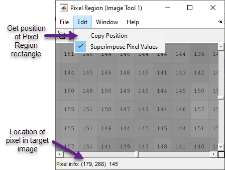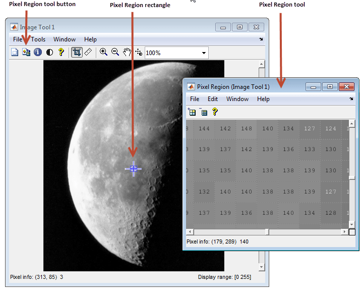 Можно также получить информацию о пиксельной области из рисунка, например, с помощью imshow, с помощью impixelregion функция.
