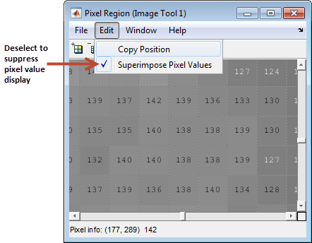 Чтобы сохранить отображаемую информацию о местоположении и значении пикселя, щелкните правой кнопкой мыши пиксель на изображении и выберите опцию Копировать информацию о пикселе. Средство просмотра изображений копирует координаты x и y и значение пикселя в буфер обмена. Можно вставить эту информацию о пикселах в рабочую область MATLAB ® или другое приложение, щелкнув правой кнопкой мыши и выбрав команду Вставить (Paste) в контекстном меню.
