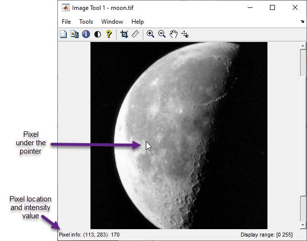 Можно также получить информацию о значениях пикселей из фигуры с помощью imshow с помощью impixelinfo функция.