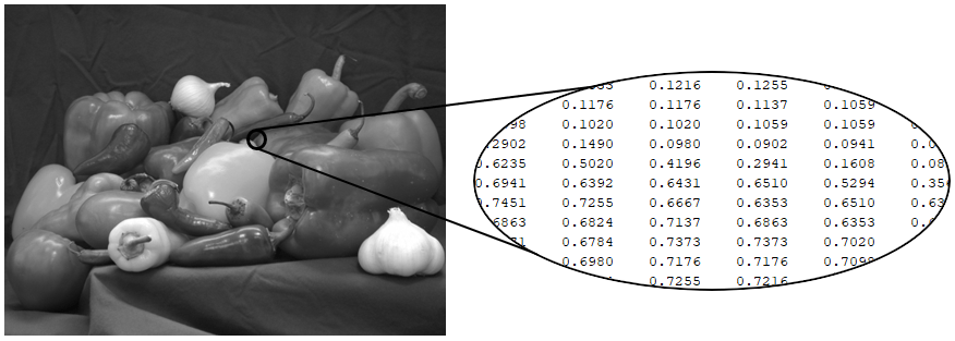 Изображение в градациях серого - это матрица данных, значения которой представляют интенсивности одного пикселя изображения. В то время как изображения в оттенках серого редко сохраняются с помощью карты цветов, MATLAB использует карту цветов для их отображения.