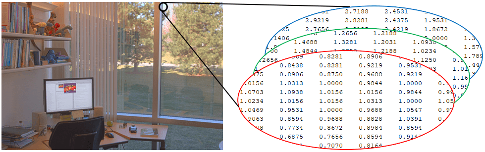 На рисунке изображены красный, зеленый и синий каналы изображения HDR с отображенным тоном с исходными значениями пикселей в диапазоне [0, 3.2813]. Отображение тонов - это процесс, который уменьшает динамический диапазон HDR-изображения до диапазона, ожидаемого монитором или экраном компьютера.