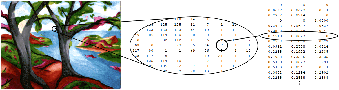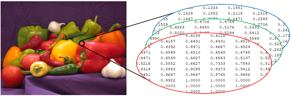 Данные изображения хранятся в виде m-на-n числовой матрицы, элементы которой являются прямыми индексами в цветовой карте. Каждая строка карты цветов определяет красный, зеленый и синий компоненты одного цвета.