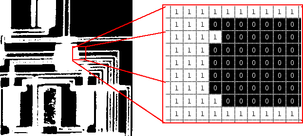 На рисунке показано двоичное изображение с крупным планом некоторых значений пикселей.