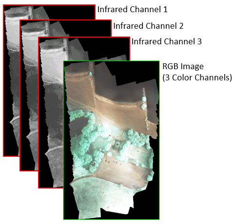 На рисунке изображено многоспектральное изображение с шестью каналами, состоящими из красного, зелёного, синего цветовых каналов (изображённых как единое изображение RGB) и трёх инфракрасных каналов.
