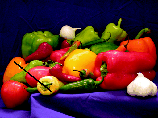 improfile функция отображает график значений интенсивности вдоль отрезка линии. Сюжет включает отдельные линии для красной, зелёной и синей интенсивностей. На графике обратите внимание, насколько низки значения синего в начале графика, где линия пересекает оранжевый перец.