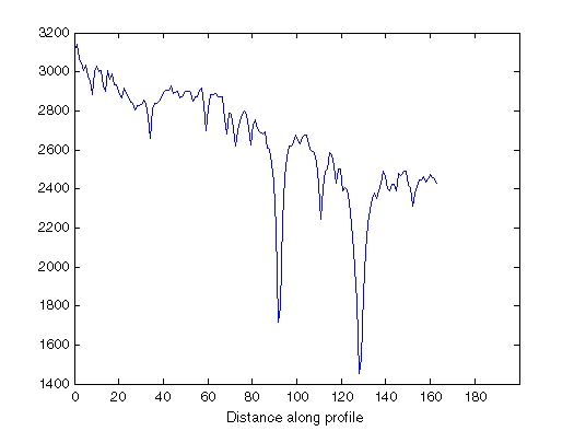 Звонить improfile без каких-либо аргументов и трассировка сегмента линии в изображении в интерактивном режиме. На рисунке черная линия обозначает отрезок линии, нарисованный сверху вниз. Дважды щелкните, чтобы завершить сегмент линии.