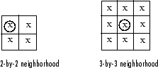Некоторые операции с двоичными изображениями могут быть реализованы наиболее легко с помощью таблиц поиска. Таблица подстановки - это вектор столбца, в котором каждый элемент представляет значение, возвращаемое для одной возможной комбинации пикселей в окрестности. Для создания таблиц подстановки для различных операций используйте makelut функция. makelut создает таблицы подстановки для окрестностей 2 на 2 и 3 на 3. На следующем рисунке показаны эти типы окрестностей. Каждый пиксель окрестности обозначается х, а центральный пиксель - окружностью.