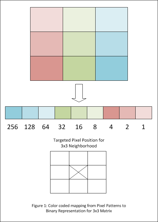 Процесс вычисления двоичного представления обработки окрестностей 3 на 3 аналогичен процессу обработки окрестностей 2 на 2.