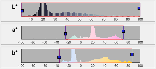 Формирователь цветовых пороговых значений поддерживает сегментацию в четырех цветовых пространствах. В каждом цветовом пространстве приложение отображает изображение, три цветовых канала и значение цвета всех пикселей в виде точек на 3-D графике цветового пространства. Цвета, включенные в маску, можно выбрать путем отображения в окне значений цветового канала или путем построения ROI на графике изображения или 3-D цветового пространства. Пример использования приложения см. в разделах "Изображение сегмента" и "Создание маски с помощью приложения" Пороговое значение цвета ".