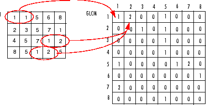На следующем рисунке показано, как graycomatrix вычисляет несколько значений в GLCM изображения 4 на 5 I. Элемент (1,1) в GLCM содержит значение 1 поскольку в изображении имеется только один экземпляр, где значения имеют два расположенных горизонтально соседних пикселя 1 и 1. Элемент (1,2) в GLCM содержит значение 2 потому что в изображении есть два экземпляра, где значения имеют два соседних по горизонтали пикселя 1 и 2. graycomatrix продолжает эту обработку для заполнения всех значений в GLCM.