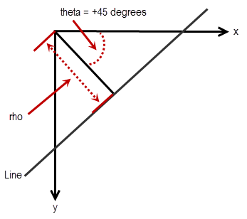 Переменная rho - это расстояние от начала до прямой вдоль вектора, перпендикулярного прямой. theta - угол перпендикулярной проекции от начала к линии, измеренный в градусах по часовой стрелке от положительной оси X. Диапазон тета - -90 ° ≤ Угол самой линии - θ + 90 °, также измеряемые по часовой стрелке относительно положительной оси X.