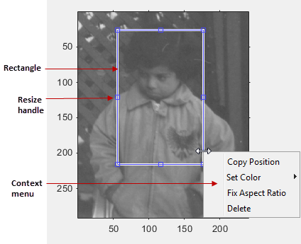 | Удаление прямоугольника | Переместите указатель внутрь прямоугольника или на кромку прямоугольника. Щелкните правой кнопкой мыши и выберите в контекстном меню команду «Удалить». Чтобы удалить этот параметр из контекстного меню, установите Deletable свойство false: h = imrect(); h.Deletable = false; |