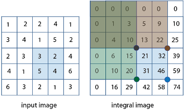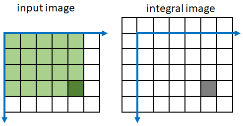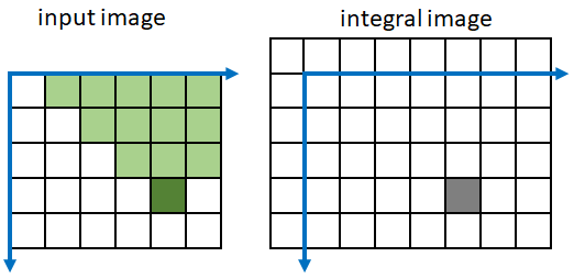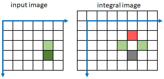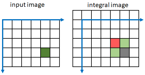 В интегральном изображении каждый пиксель представляет совокупную сумму соответствующего входного пикселя со всеми пикселями выше и слева от входного пикселя.