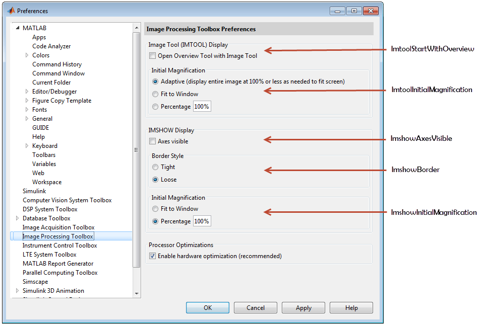 Диалоговое окно «Настройки панели инструментов обработки изображений» содержит настройки отображения для imtool, imshowи предоставляет возможность оптимизации аппаратного обеспечения. Список всех поддерживаемых настроек с информацией о том, как задать их в командной строке, см. в разделе iptsetpref. На рисунке показано, как настройки соотносятся с параметрами в диалоговом окне «Настройки».