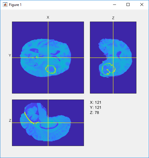 Использовать orthosliceViewer для просмотра отдельных фрагментов в томе. orthosliceViewer , отображая центральный фрагмент в каждом размере. Каждый вид стека изображений содержит перекрестие, которое можно использовать для просмотра различных фрагментов стека изображений. Перекрестие связано таким образом, что при перемещении перекрестия на связанных видах также перемещаются.