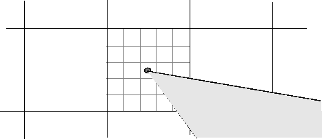 0 0 0 0 0 0 0 0 0 0 0 0При создании маски области интересов (ROI) poly2mask должен определить, какие пикселы включены в область. Это определение может быть затруднено, когда пикселы на краю области лишь частично покрыты линией границы. Следующий рисунок иллюстрирует интересующую треугольную область, рассматривая крупным планом одну из вершин ROI. На рисунке показано, как пиксели могут быть частично покрыты границей интересующей области.