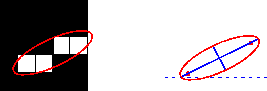 'Orientation' | Угол между осью X и главной осью эллипса с теми же секундными моментами, что и область, возвращается в виде скаляра. Значение в градусах, в диапазоне от -90 градусов до 90 градусов. На этом рисунке показаны оси и ориентация эллипса. В левой части рисунка показана область изображения и соответствующий ей эллипс. На правой стороне показан тот же эллипс с сплошными синими линиями, представляющими оси. Красные точки - это очаги. Ориентация - это угол между горизонтальной пунктирной линией и главной осью.