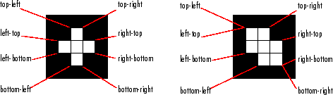 'Extrema' | Экстремальные точки в регионе, возвращенные в виде матрицы 8 на 2. Каждая строка матрицы содержит координаты x и y одной из точек. Формат вектора: [top-left top-right right-top right-bottom bottom-right bottom-left left-bottom left-top]. Этот рисунок иллюстрирует крайность двух различных областей. В регионе слева каждая крайняя точка различна. В регионе справа определенные экстремальные точки (например, top-left и left-top) идентичны.