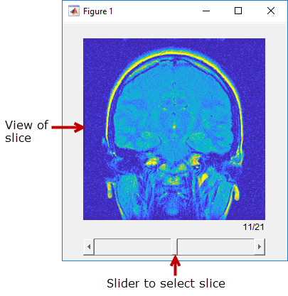 sliceViewer( отображает оттенки серого или RGB-том S)S на рисунке. Рисунок содержит ползунок, который можно использовать для просмотра отдельных фрагментов объема.