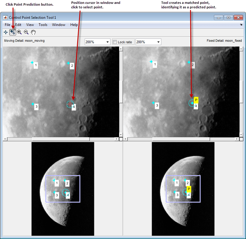 Инструмент выбора контрольных точек позволяет выбрать контрольные точки на регистрируемом изображении (движущееся изображение) и опорном изображении (фиксированное изображение). При запуске cpselect, выбор точек по умолчанию включен.