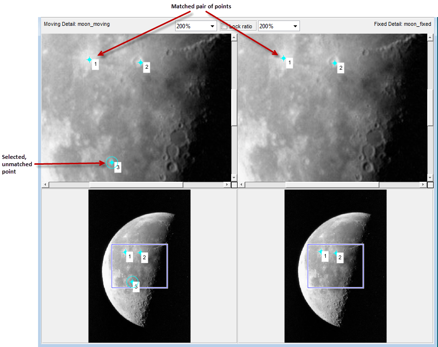 Контрольные точки задаются путем указания и щелчка на движущихся и фиксированных изображениях в окнах «Подробности» или «Обзор». Каждая точка, заданная на движущемся изображении, должна соответствовать фиксированному изображению. В следующих разделах описаны способы выбора пар управляющих точек с помощью инструмента «Выбор контрольной точки».