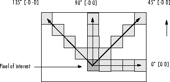 -1 -1; -2 -2; -3 -3; -4 -4];Рисунок иллюстрирует пространственные отношения пикселей, которые определены этим массивом смещений, где D представляет расстояние от интересующего пикселя.