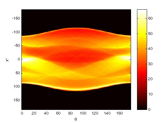 Обратите внимание, что некоторые функции входного изображения отображаются в этом изображении преобразования. Первый столбец в преобразовании Радона соответствует проекции при 0 °, которая интегрируется в вертикальном направлении. Самый центральный столбик соответствует проекции под 90 °, которая интегрируется в горизонтальном направлении. Проекция при 90 ° имеет более широкий профиль, чем проекция при 0 °, благодаря большей вертикальной полуоси крайнего эллипса фантома.