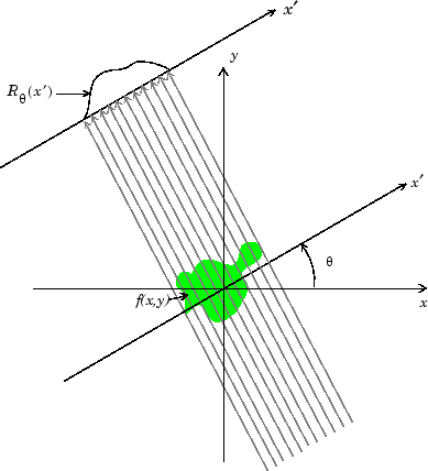 Геометрия параллельного луча, используемая на рисунке, аналогична геометрии, описанной в преобразовании Радона. f (x, y) обозначает яркость изображения, и ′) является проектированием в угловой тете.