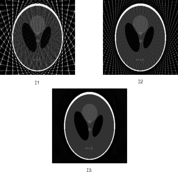 На следующем рисунке показаны результаты всех трех реконструкций. Обратите внимание, как изображение I1, которая была реконструирована только из 18 проекций, является наименее точной реконструкцией. Изображение I2, который был реконструирован из 36 проекций, лучше, но все еще недостаточно ясно, чтобы четко различить маленькие эллипсы в нижней части изображения. I3, реконструированный с использованием 90 проекций, больше всего напоминает оригинальное изображение. Обратите внимание, что когда число проекций относительно мало (как в I1 и I2), реконструкция может включать в себя некоторые артефакты из задней проекции.