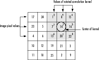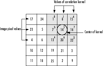 Операция, называемая корреляцией, тесно связана со сверткой. При корреляции значение выходного пикселя также вычисляется как взвешенная сумма соседних пикселей. Разница в том, что матрица весов, в данном случае называемая корреляционным ядром, не поворачивается во время вычисления. Функции проектирования фильтра Toolbox™ обработки изображений возвращают ядра корреляции.