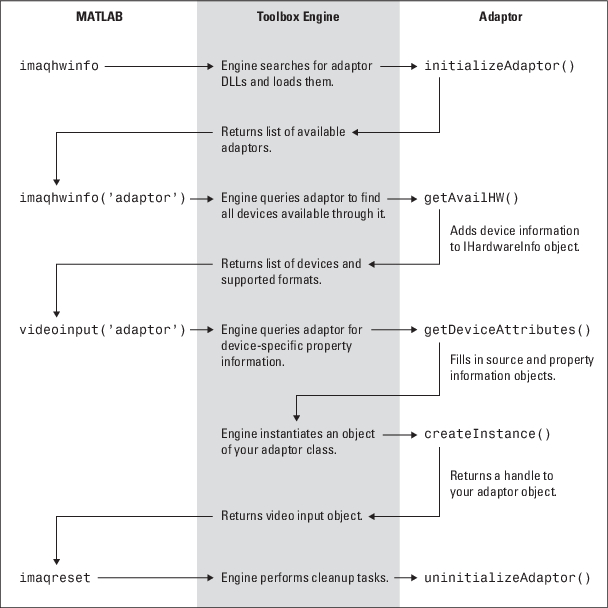 На следующем рисунке показан поток управления между командной строкой MATLAB ®, механизмом панели инструментов и экспортируемыми функциями адаптера. Обратите внимание, что на рисунке не показано, как адаптер взаимодействует с SDK устройства для получения информации. Это зависит от SDK каждого устройства.