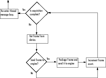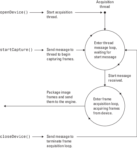 Цикл сообщений потока является основным циклом обработки в функции потока получения. Вы создаете резьбу в openDevice() функция. Функция потока получения входит в цикл сообщений потока, ожидая, когда сообщение начнет получение кадров. Ваш адаптер startCapture() функция посылает сообщение потоку получения, указывая ему начать получение кадров. В этом примере используется WM_USER сообщение для указания этого состояния. Дополнительные сведения см. в разделе Отправка сообщения в поток сбора данных.