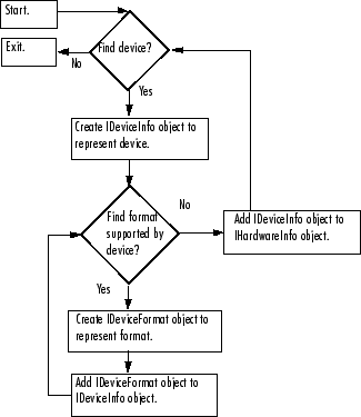 Для каждого устройства, которое требуется сделать доступным через адаптер, необходимо создать IDeviceInfo а затем сохранить объект в IHardwareInfo объект. Для каждого формата, поддерживаемого устройством, необходимо создать IDeviceFormat а затем сохранить объект в IDeviceInfo объект.