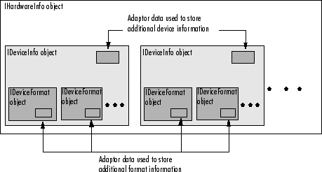 Обратите внимание на рисунке, что оба IDeviceInfo и IDeviceFormat объекты содержат данные адаптера. Данные адаптера - это дополнительный способ хранения дополнительной информации об устройстве или формате в IDeviceInfo или IDeviceFormat объект. Дополнительные сведения см. в разделе Определение классов для хранения информации о конкретных устройствах.