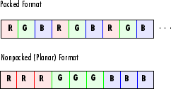 Комплект адаптера IAdaptorFrame класс определяет множество FRAMETYPE перечисления, которые охватывают множество возможных типов устройств данных изображения, могут возвращаться. Например, некоторые устройства могут возвращать цветные изображения в упакованном или неупакованном (плоском) формате. Эти форматы описывают расположение байтов красных, зеленых и синих данных в памяти. В упакованных форматах красные, зеленые и синие тройни группируются вместе. В неупакованных форматах все красные данные сохраняются вместе, за ними следуют все зеленые данные, за которыми следуют все синие данные. На следующем рисунке показано это различие.