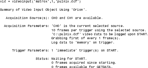 Для просмотра сводки характеристик созданного объекта ввода видео введите в командной строке имя переменной, назначенной объекту. Например, это сводка для объекта vid.