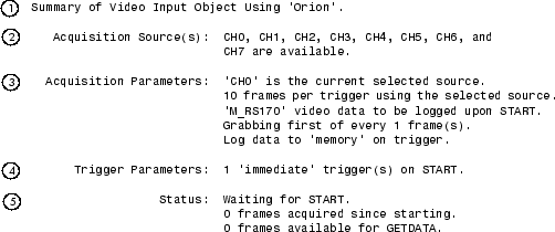 Заголовок сводки включает в себя имя устройства получения изображения, которое представляет этот объект. В примере это рамный захватчик Matrox Orion.
