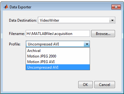 Полученные в памяти данные можно экспортировать в MAT-файл, рабочую область MATLAB ®, VideyWriter или другие параметры.
