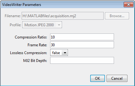После выбора имени файла и профиля и нажатия кнопки OK откроется диалоговое окно «Параметры VideoWriter». Motion JPEG 2000 или Archival как Ваш профиль, Вы можете установить Степень сжатия, Частоту кадров, Сжатие Без потерь и варианты Битовой глубины MJ2. Примите значения по умолчанию или измените их.