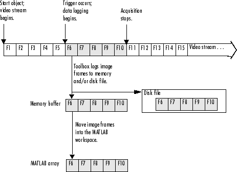 При срабатывании триггера панель инструментов получает кадры из видеопотока и записывает кадры в буфер памяти, дисковый файл или и то, и другое, в зависимости от значения LoggingMode собственность. Для работы с этими записанными данными изображения необходимо поместить их в рабочую область MATLAB ® .