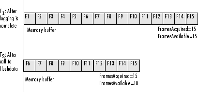На следующем рисунке показаны кадры, полученные до и после вызова flushdata. Обратите внимание, как flushdata удаляет кадры, связанные с самым старым триггером.